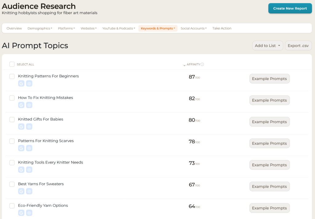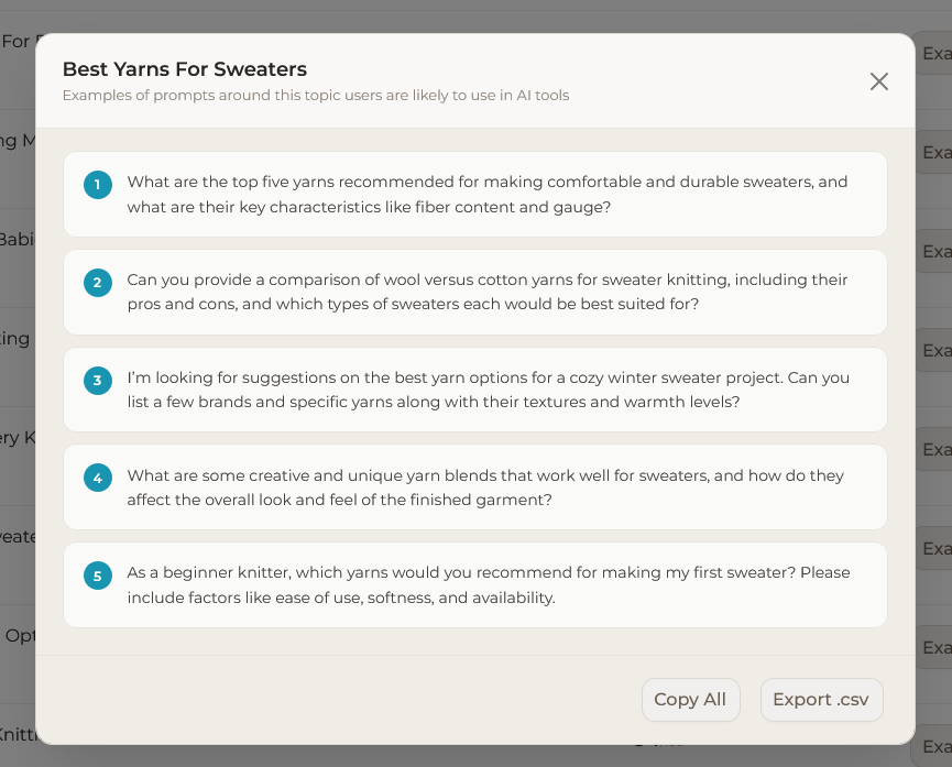 Am I 100% certain that these topics of research are the ones Knitting hobbyists shopping for fiber art materials are most likely to prompt AIs about, in exactly this order? No. Is it likely better than anything else you can get (without spending thousands on custom clickstream data)? Absolutely.