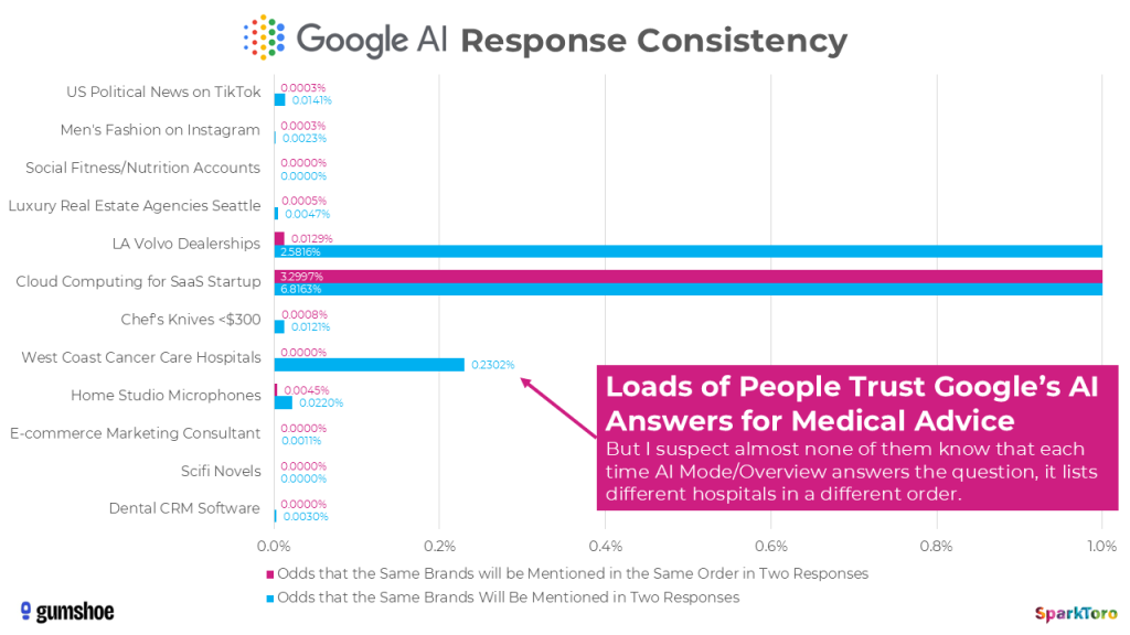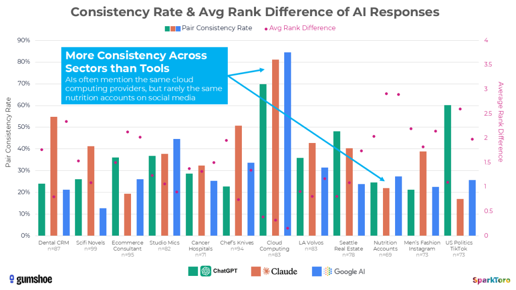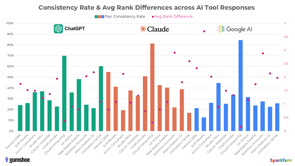 To get mathematical about it, there’s a <1 in 100 chance that ChatGPT or Google’s AI, if asked 100X, will give you the same list of brands in any two responses. Claude is just slightly more likely to give you the same list twice in a hundred runs, but even less likely to do so in the same order.