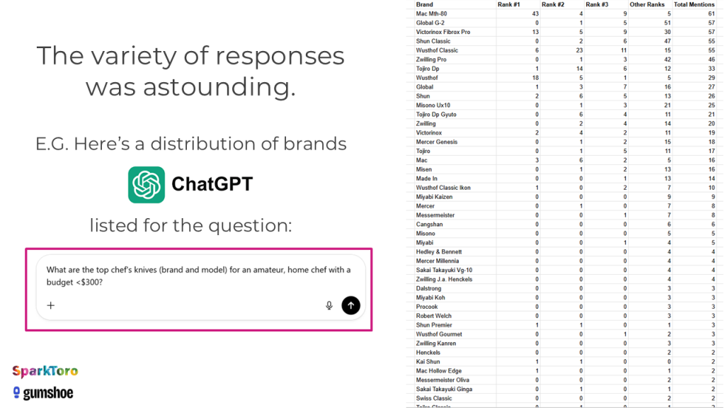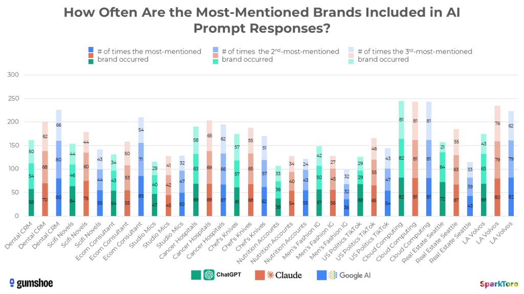 In fact, when it comes to ordering, AI tool responses are so random that it’s more like 1 in 1,000 runs before you’d see two lists in the same order. And we didn’t even try to collect data on how the AIs described each brand or how positive/negative sentiment was around the recommendation.