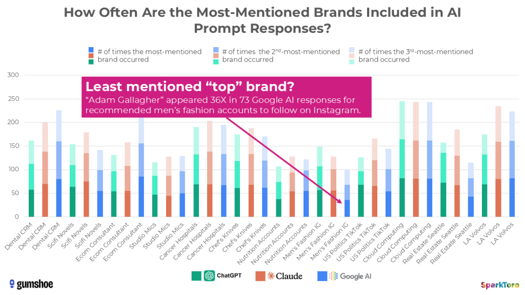 Another example — men’s fashion influencer Adam Gallagher only came up 36X in the 73 responses Google’s AI gave when asked for recommendations in this space.