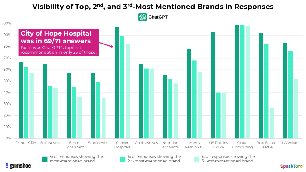 Let’s briefly return to that example of West Coast cancer care hospitals. In ChatGPT’s results, City of Hope hospital in Los Angeles showed up in 69/71 answers: a 97% visibility rate.