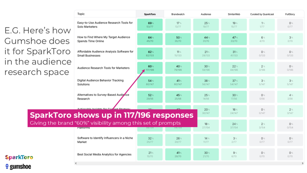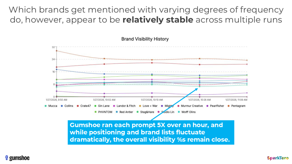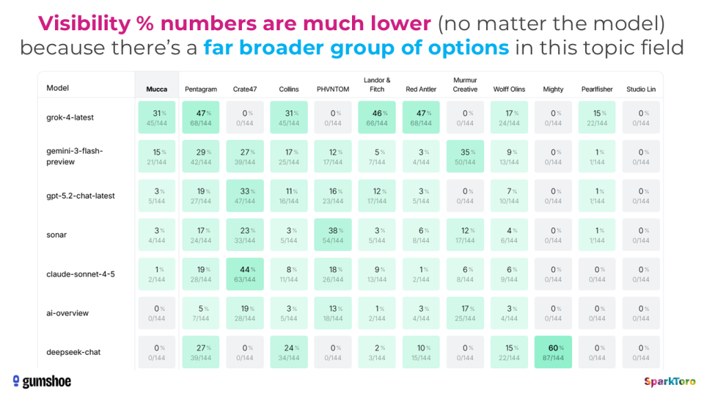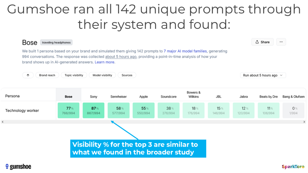 When Gumshoe ran their analysis showing the visibility percentages and rankings for the headphones prompts, the top brands often had 90-100% visibility, while the brand design agencies prompt produced high numbers in the 30%s-40%s. Note that they also make far prettier, easier-to-read charts to synthesize this data than I did above (apologies, I ran out of time to do more sophisticated data visualization).