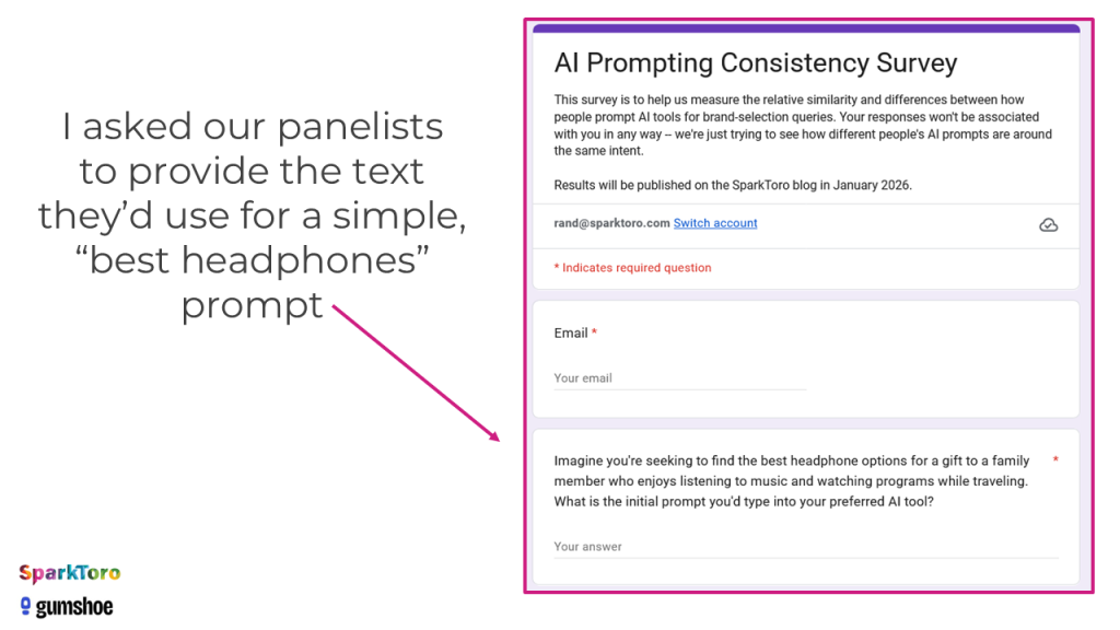 I always love these questions, because the insinuation is simultaneously: “I don’t believe your results and am also unwilling to do any work to validate or disprove them.” No, I/we aren’t professional researchers or credentialed data scientists. I’ve published dozens of previous research pieces in the field of digital marketing, been cited by the U.S. Congress, Dept. of Justice, and hundreds of notable media publications, but that doesn’t make me a professional. And I *really* hope more credentialed researchers will be inspired by our design and publication to undertake a more significant, science-journal-publication-quality work on this topic. But if your skepticism is immense or you perceive that our process was overly flawed, please repeat these experiments and publish your work — I’ll even link to it from here and retract bad takes/point out flaws in our work. - Did we put constraints on the survey takers’ AI tool methodologies in any way?