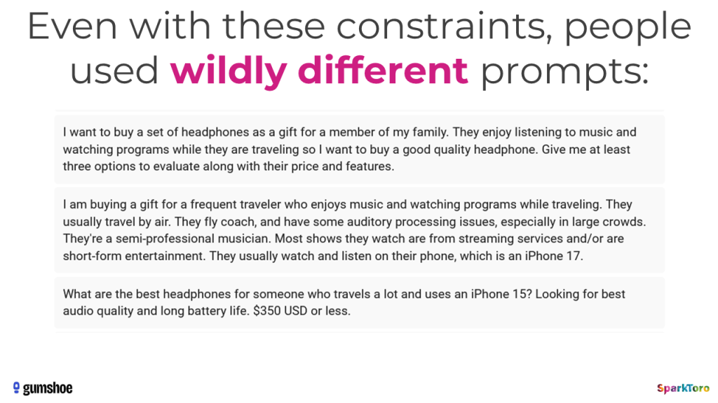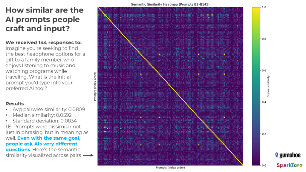 - Users almost never craft similar prompts, even when they have the same intent. The variation of brands/recs in AI answers around a space in the messy wilds of AI prompting is likely much higher than what our controlled experiments revealed here.