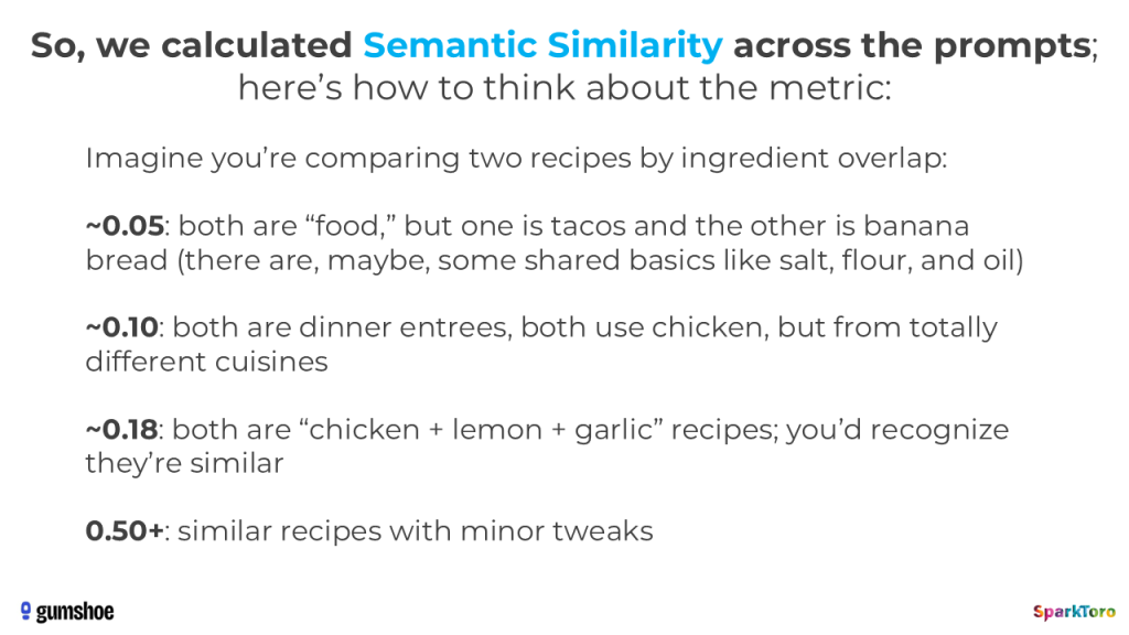 Once again, the results were massively unique — similar rates of semantic similarity (or lack thereof). And, once again, we see exactly the expected results when Gumshoe sent those prompts to the AI tools:
