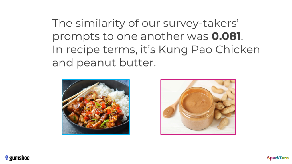 Overall, semantic similarity of these prompts was 0.081. Or, in the language of recipes, it’s like the average pair of prompts were Kung Pao Chicken and Peanut Butter — key ingredients had overlap, but other than being foods with peanuts in them, they’re not especially close.