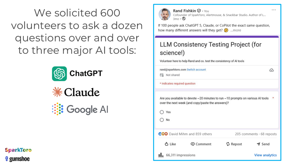 The Problem: For the last few years, companies have been investing inordinate sums into AI tracking and AI visibility for their brands and products. $100M+/yr is already estimated to be spent on this new version of search analytics and yet, I could find absolutely no research showing whether AI tools are consistent enough, when prompted for lists of brand/product recommendations, to produce valid visibility metrics. There are loads of studies about AI accuracy (in fact, we used Carnegie Mellon’s Estimating LLM Consistency: A User Baseline vs Surrogate Metrics as a model for this work), but when it came to answering the question of whether ChatGPT, Claude, or Google AI produce consistent enough lists of results to be usefully tracked… Nothing.