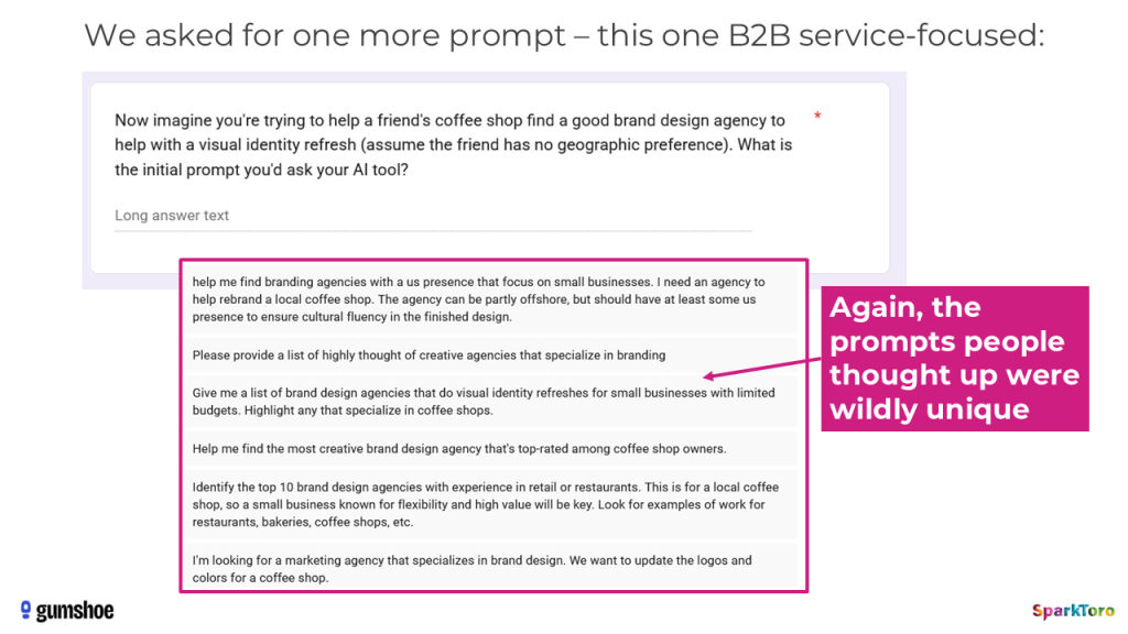 We’re almost done, but there was one last experiment to try — a B2B prompt in a super-wide space (similar to SciFi novels) — that could show us whether unique, human-crafted prompts in a broad sector would provide the expected, broader range of answers. So, we asked panelists to input a prompt seeking brand design agencies for their friend’s coffee shop.