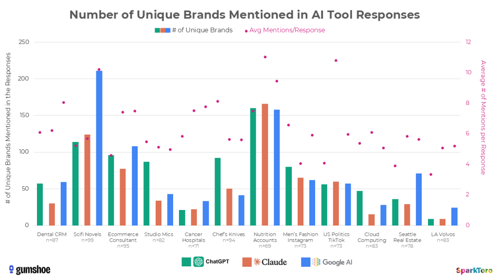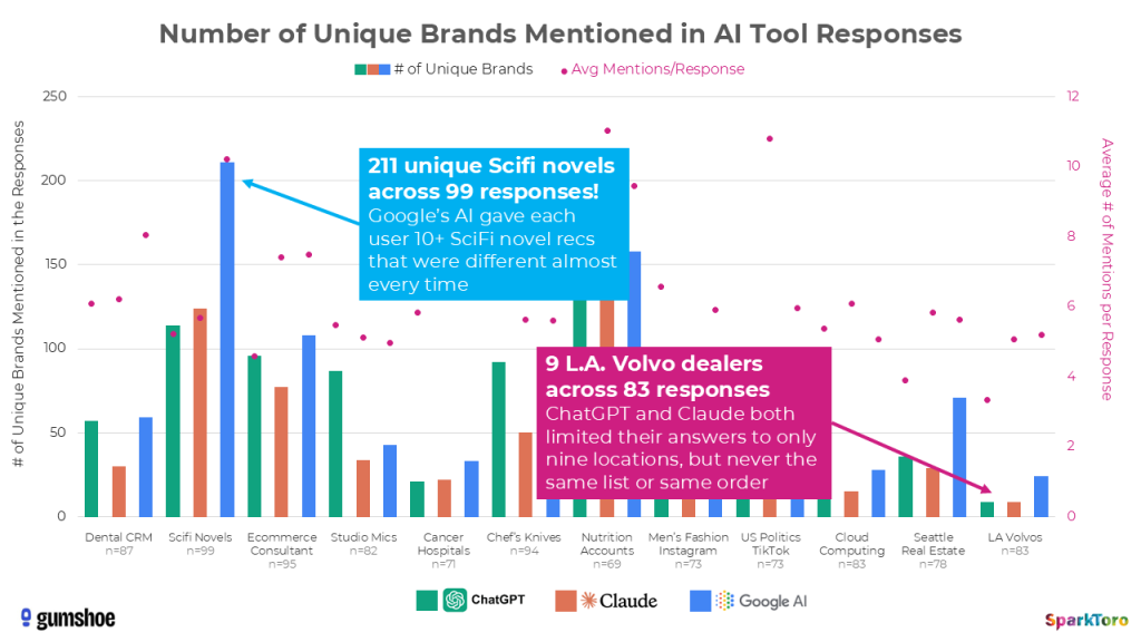 What you’re seeing with the green (ChatGPT), orange (Claude), and blue (Google AI) bars is the number of unique brands, products, and entities recommended by the AI response to the prompts. The range appears to be all over the place, but is in fact closely tied to how many entities frequently appear in documents in the AI corpora around the topic (e.g. there are less than a dozen Volvo dealerships in Los Angeles, but thousands of recently-published Science Fiction novels). Those pink scatterplot-style dots, meanwhile (graphed on the secondary axis) show the average number of responses the AI tools gave (another factor complexifying the ranking/visibility problem).