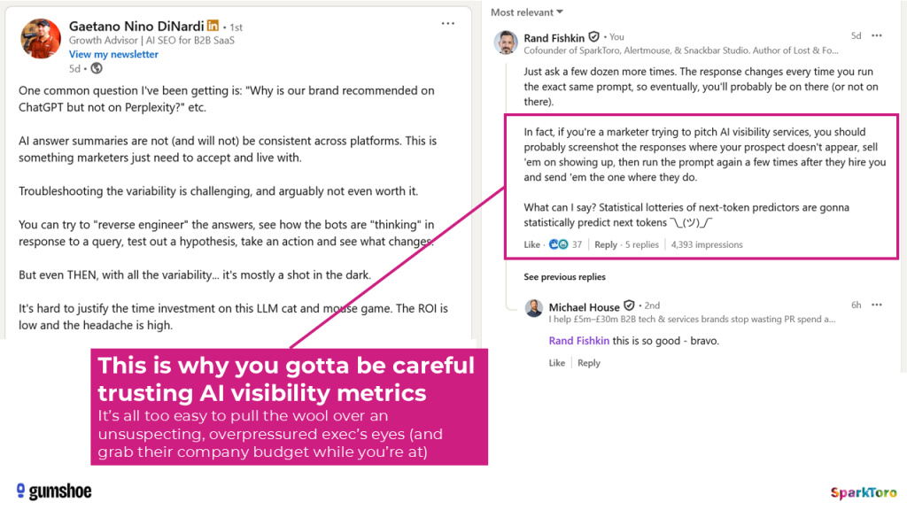 As I pithily pointed out on Gaetano DiNardi’s LinkedIn post last week, AI visibility “experts” could easily weaponize this knowledge, just as sketchy SEO salespeople did in decades past. Buyer beware.