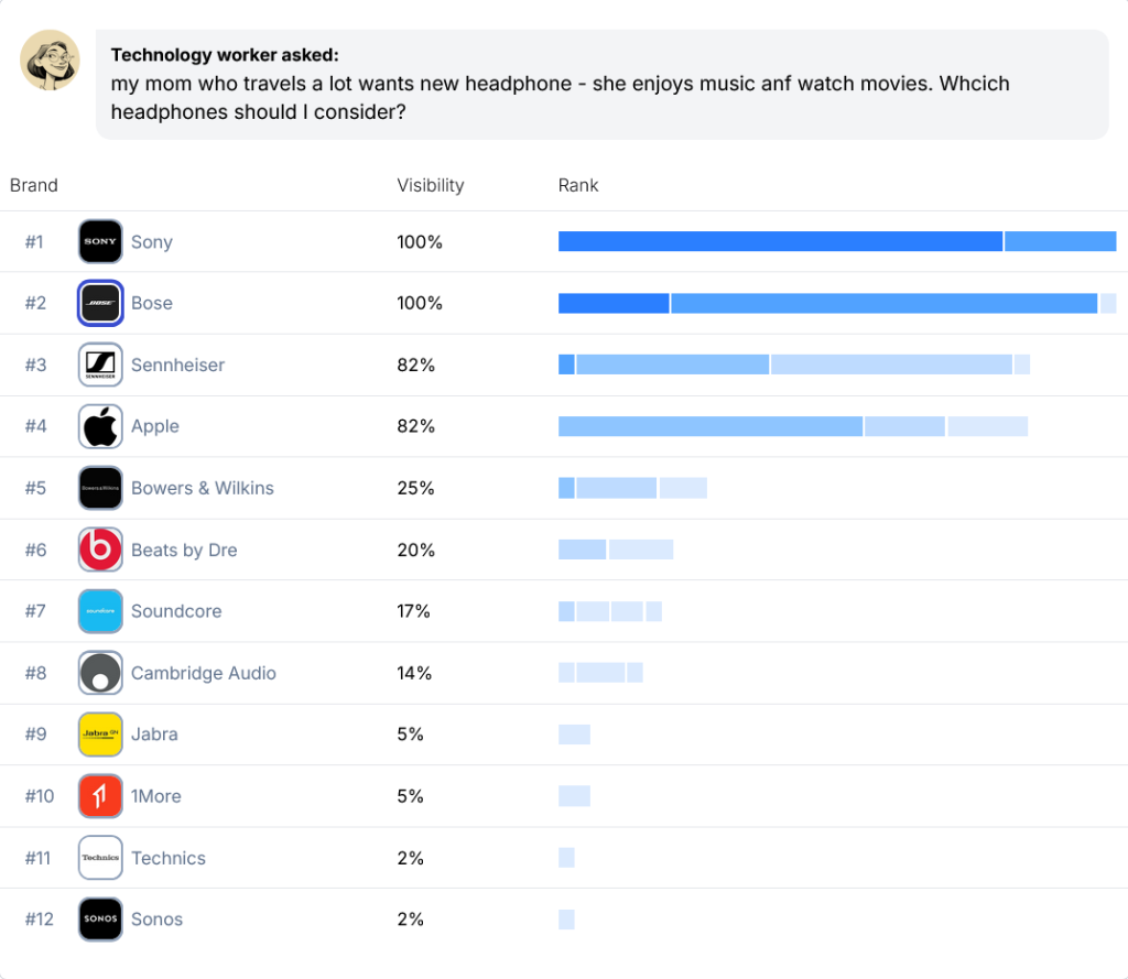 Running 142 human-crafted prompts about choosing the best headphones for a traveling family member multiple times resulted in nearly a thousand responses: 994 to be precise. And across those 994 AI responses, headphones like Bose, Sony, Sennheiser, and Apple showed up 55-77% of the time; remarkably similar to what we saw with top 3 brands in the tighter spaces from our survey-takers’ results in topics like L.A. Volvo dealerships, cloud computing providers for SaaS startups, and cancer care hospitals on the West Coast.