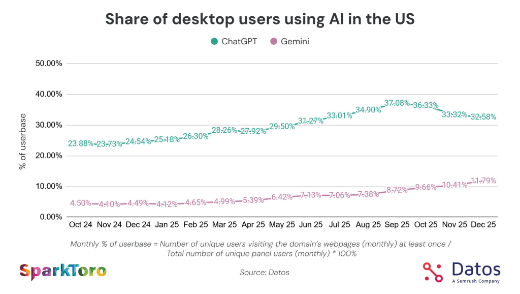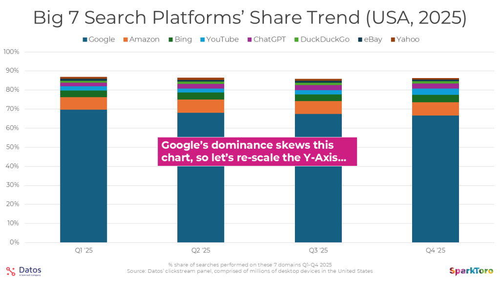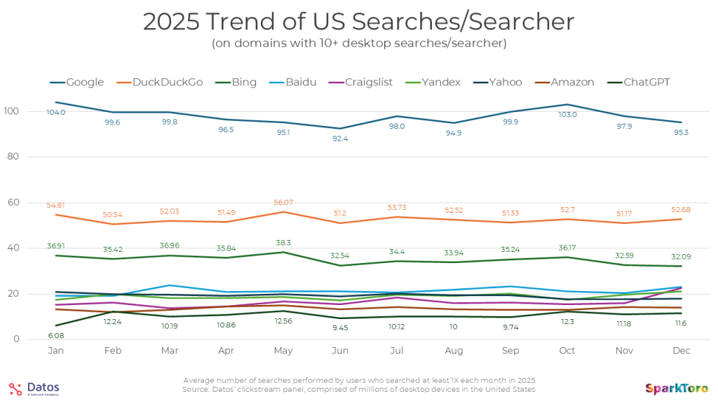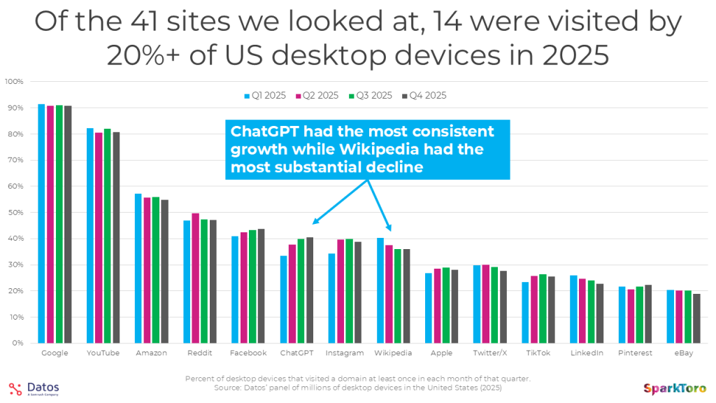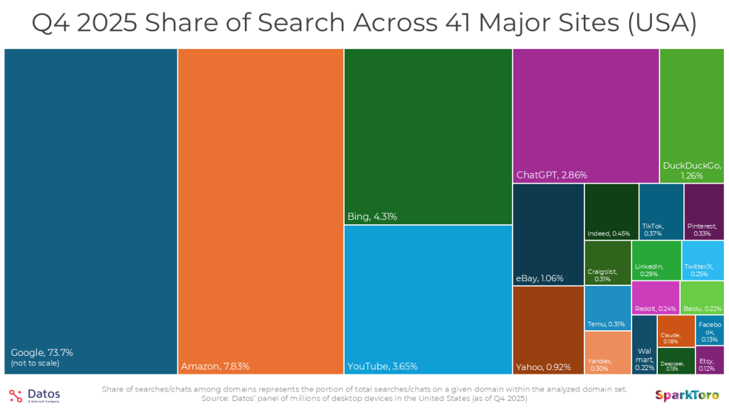 This isn’t search (yet, we’ll get to that), it’s the percent of the millions of devices that make up Datos’ panel who visited each domain at least 1X each month of the quarter, shown over Q1-Q4 2025. The most notable trends for me was the decline for Wikipedia (likely from Google sending them far less traffic than they once did), the rise of Instagram’s desktop traffic (in years prior, they were mobile-only, and then had limited desktop features, but they’ve clearly become a force on desktop, too), and perhaps most interestingly, the growth (then flattening) of ChatGPT.