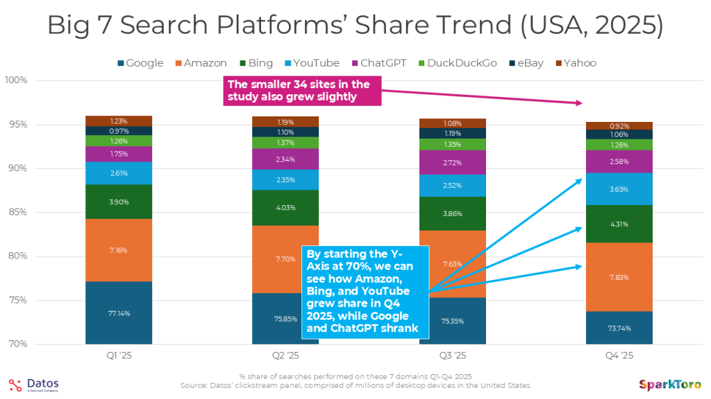 Also of note are the growth of Amazon, Bing, and YouTube, while ChatGPT and Google shrank. And not a small amount either — Google lost 3.5 points of share. I can’t think of any other metric by which Google shrank in 2025 (except perhaps consumer perception and employee trust?).