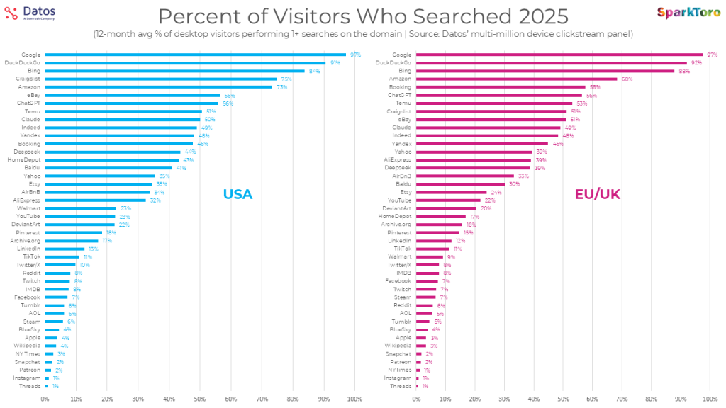 Methodology: we used Datos’ 2025 desktop panel of millions of devices in the United States and the 27 EU member countries plus the United Kingdom, broken down by month/quarter to provide the data below. We analyzed 41 domains for this study across numerous verticals (traditional search, e-commerce, AI tools, reference sites, travel, real estate, classifieds, and more). These were editorially chosen by Rand, based on the most visited 250 domains in Datos’ panel, narrowed down by those with relevant search behavior (e.g. yes to Instagram, no to USPS.com). Not every site we wanted to analyze was part of this, and we hope to do even more in the future, but it’s the most comprehensive analysis of its kind by far.