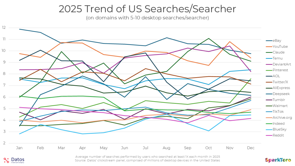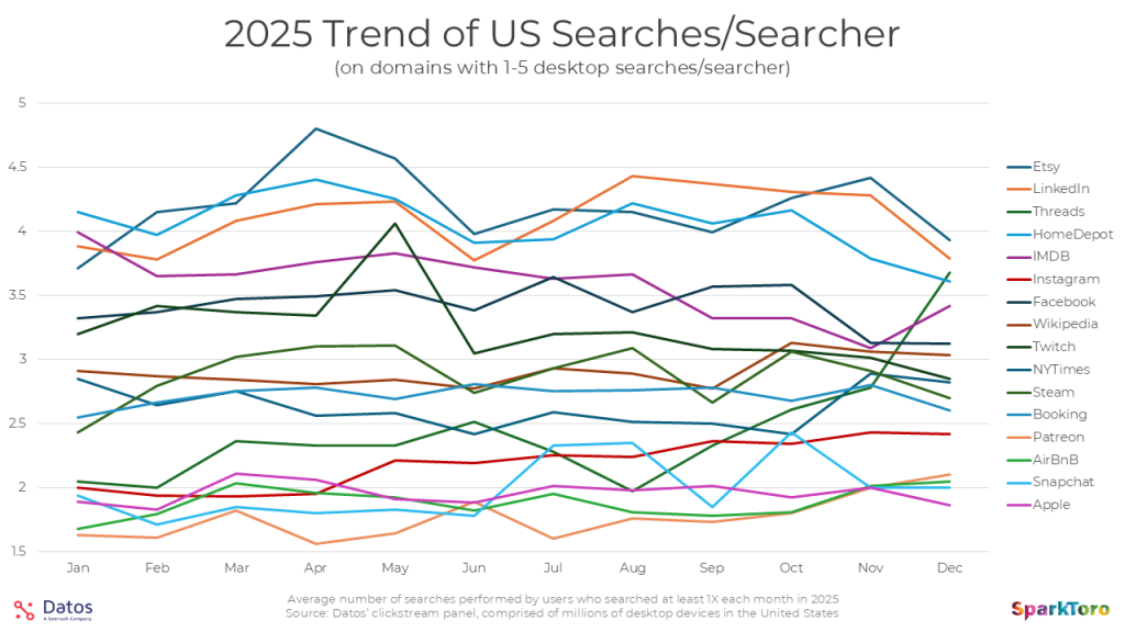 Finally, in the 1-5 searches group, I’m particularly surprised by LinkedIn’s presence here (I expected they’d be a more popular search destination mainly because so many people are looking for, well… people). My guess (and this is just a guess) is that both they and Reddit are low because, while there’s lots of search demand, Google is better at searching LinkedIn and Reddit than their own site search functions. It’s also worth calling out Threads’ remarkable growth, from ~2 searches/searcher to nearly 4 over the course of the year. This is likely a result of heavier use and greater importance of the network: in January 2026, they surpassed Twitter/X’s daily users (at least on mobile).