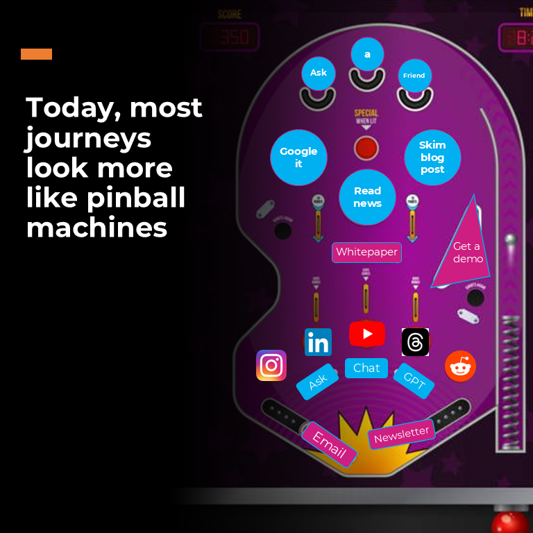 Today, people using the web and the real world to discover and solve problems don’t cleanly move as groups from a few channels at the top of the funnel to a few different channels in the middle to your website, a phone call, or storefront at the bottom. Nope. They look like… well, pinball machines.