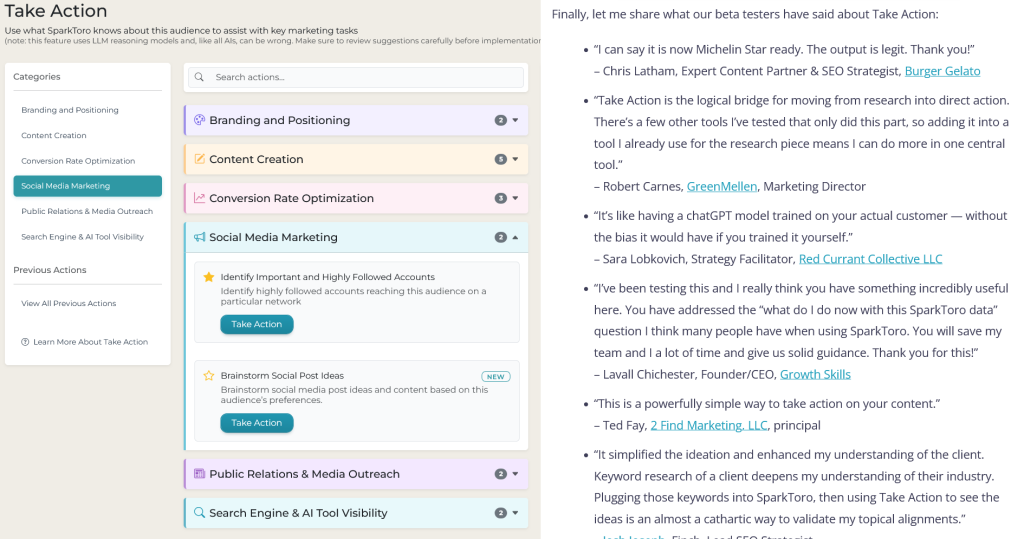 But, her most powerful contribution to date is certainly her extraordinary work on SparkToro’s new Take Action feature. You might have seen the 16 “actions” available in this new product—all of those are the result of hours of painstaking testing, refinement, and design by Kristy. She took concepts from myself and Amanda, turned them into high quality prompts, tested which data from SparkToro was needed to get the best possible results from the LLM API calls, worked with Casey to implement, and then took multiple rounds of our feedback to produce something exceptional (as you can see from the incredible feedback of savvy marketers who’ve used it 👇).