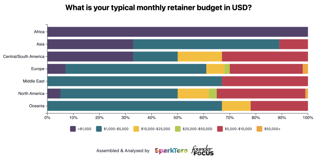 To further break the numbers down by location, typically the super large retainers of $25,000 per month upwards are only reported in North America and Europe. Whilst the majority of smaller retainers are reported by agencies who primarily work in Africa, Asia and Central/South America.