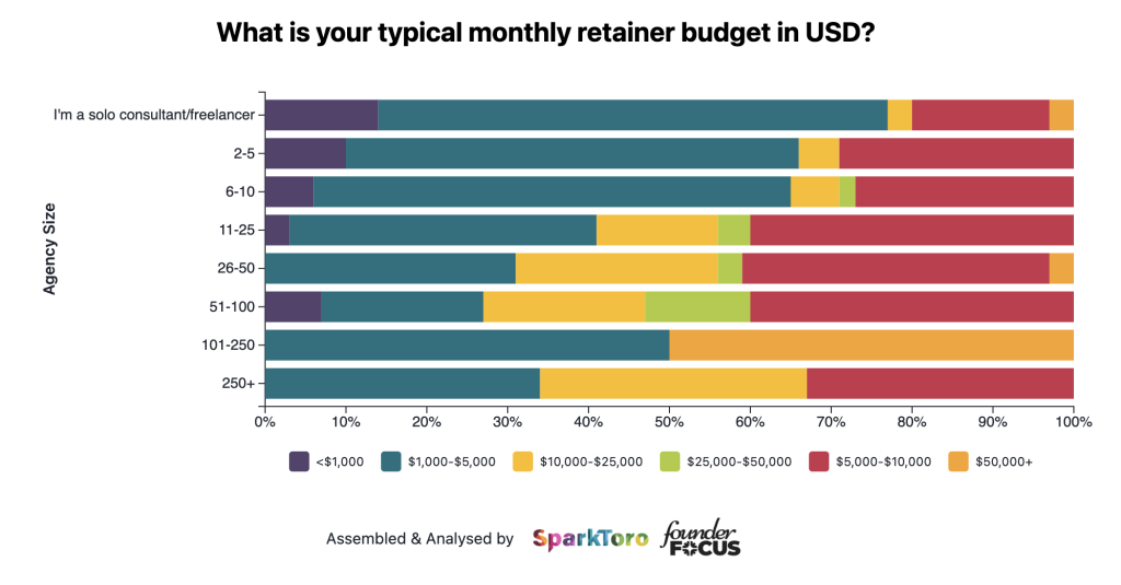 If we segment by agency size, we can see that typically, the $5,000-$10,000 per month budget range becomes more common as agencies grow towards 50 people.