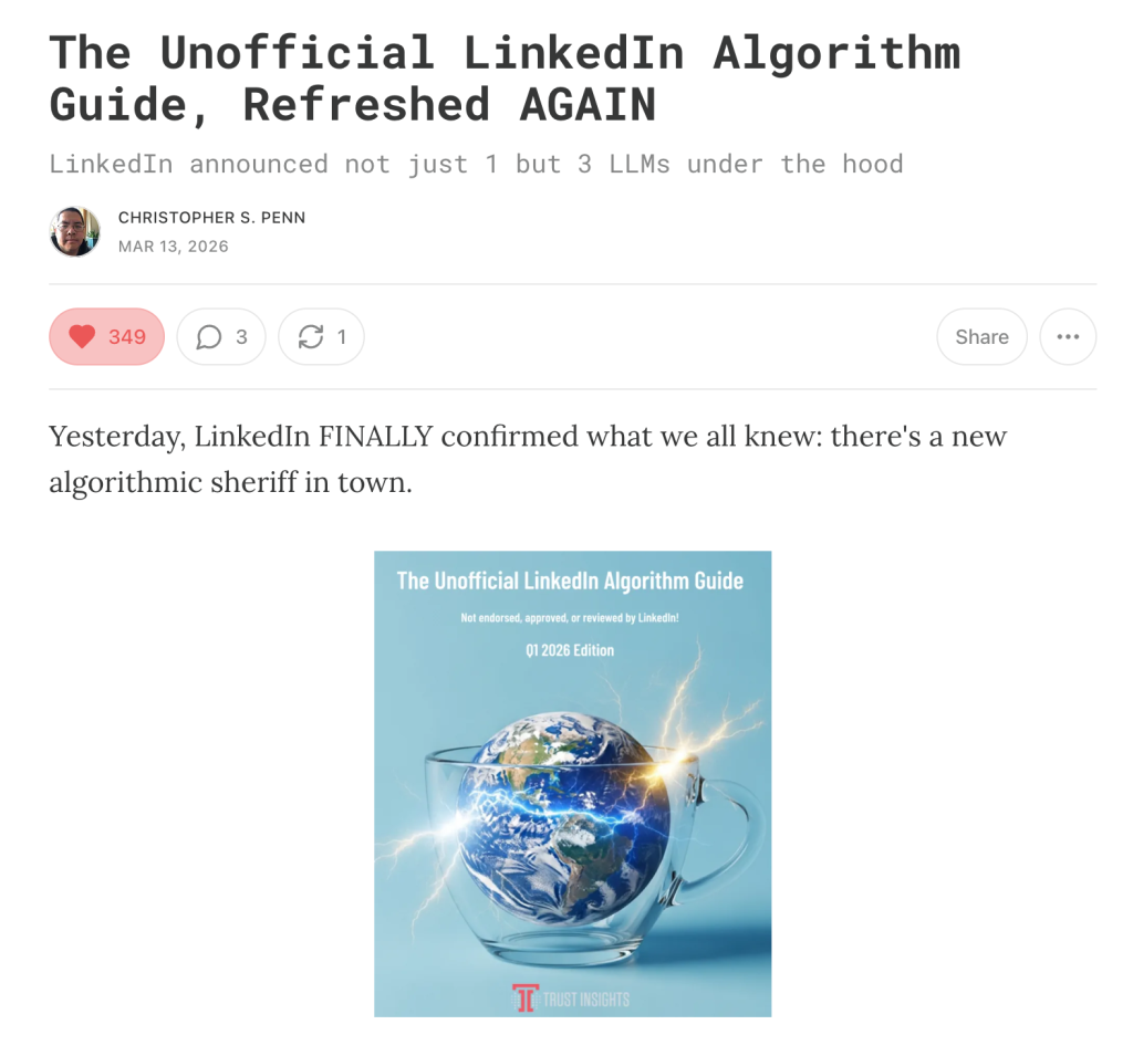 By the way, if you want the quick, conversational version of this analysis, I covered it in a recent episode of my new show, the Zero Click Marketing podcast. The episode captures my early reaction to Christopher Penn’s guide; this post is the more fully developed version after I had more time to sit with the report. If you’re into quick, thoughtful takes on content, distribution, and how modern marketing actually works, subscribe wherever you get your podcasts. 🙂