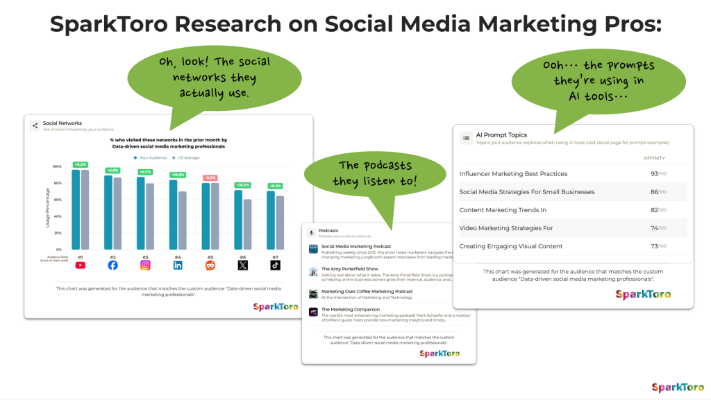 This is also where SparkToro can be a particularly useful partner. If LinkedIn’s retrieval system is trying to understand who you are, what you talk about, and which audiences your content belongs with, then audience alignment can’t just be you holding a finger to the wind. You need to know which creators, publications, podcasts, websites, and topics your audience already pays attention to. That’s the kind of research SparkToro is built for. It helps you identify the communities and signals that already matter to the people you want to reach — so you can engage more intentionally, participate in the right conversations, and create content that’s more likely to resonate with them.